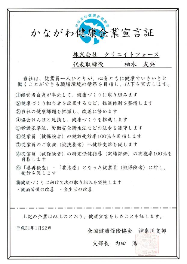 グループ会社の株式会社クリエイトフォースは、全国健康保険協会 神奈川支部より「かながわ健康企業宣言証」を取得いたしました。