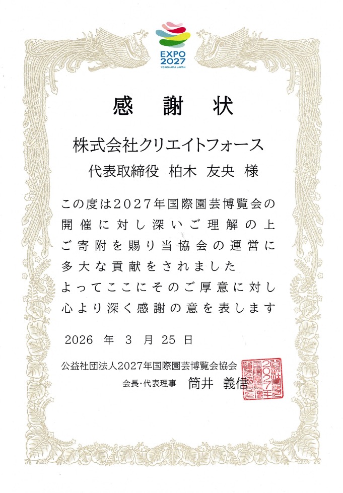グループ会社のクリエイトフォースは、公益社団法人2027年国際園芸博覧会協会(EXPO 2027 YOKOHAMA JAPAN)の開催趣旨に深く賛同し、運営支援のためご寄付をいたしました。